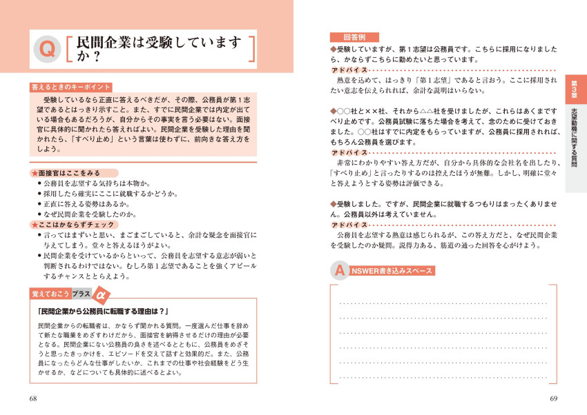 「必ず聞かれる質問Q&A」では、ジャンル別に予想される質問を回答例とともに掲載。自分の答えを記入できる書き込みスペースも用意。